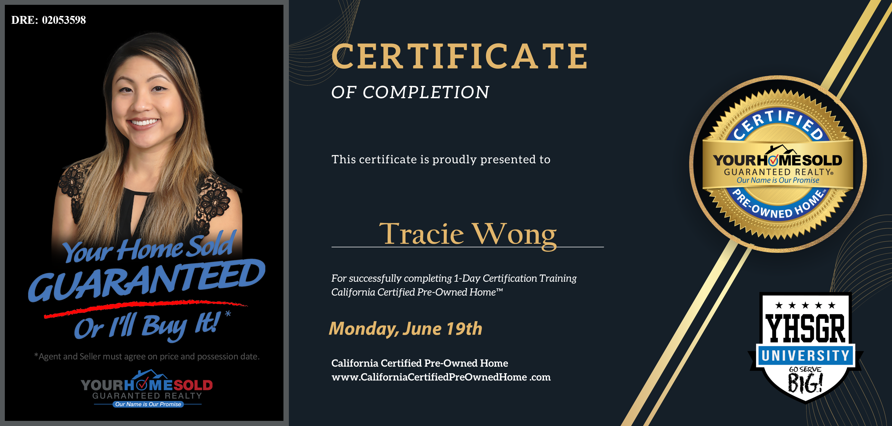 ROSEMEAD, CA, UNITED STATES, August 2, 2023/EINPresswire.com/ — Tracie Wong, a distinguished real estate agent with Your Home Sold Guaranteed Realty, has recently completed the Certified Pre-Owned Home™ agent certification. This prestigious certification equips Tracie with the knowledge and expertise to provide exceptional service to sellers and buyers in the real estate market.